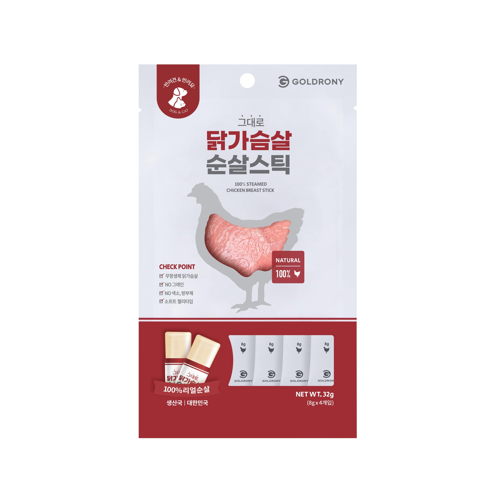 Goldrony's boneless chicken breast sticks are made with the best domestic raw materials edible by humans, and are a clean, natural snack with no salt, no preservatives, and no additives.