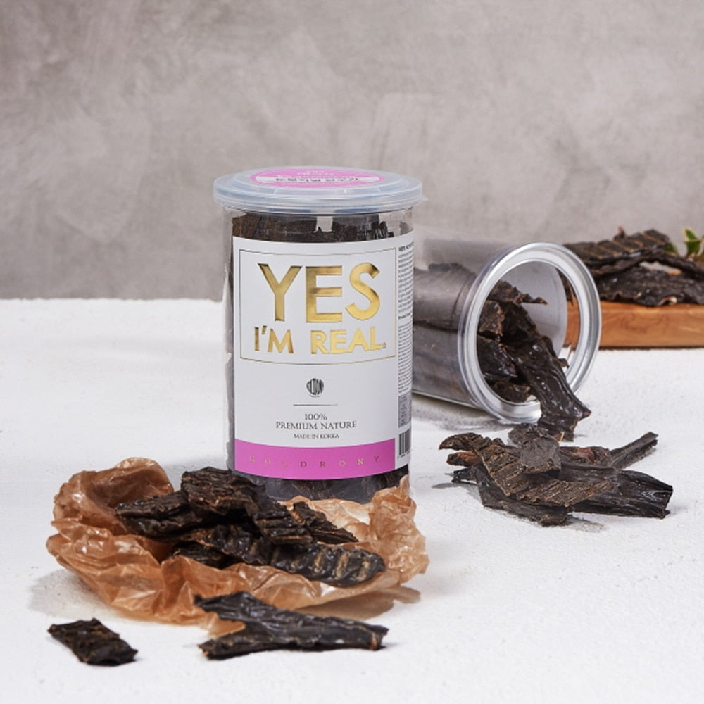 It is a natural snack with no salt, no preservatives, and no additives, and it is HACCP certified and domestically produced, so you can eat it with confidence. It is a jerky-type snack in the form of long slices.