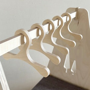 Present: A set of 5 hangers (size: width 16cm x 11.5cm x thickness 9mm) made from the finest white birch wood.