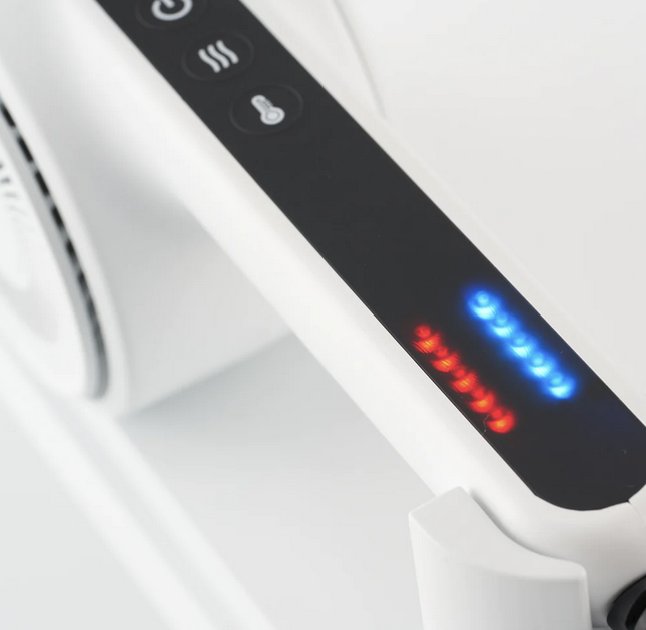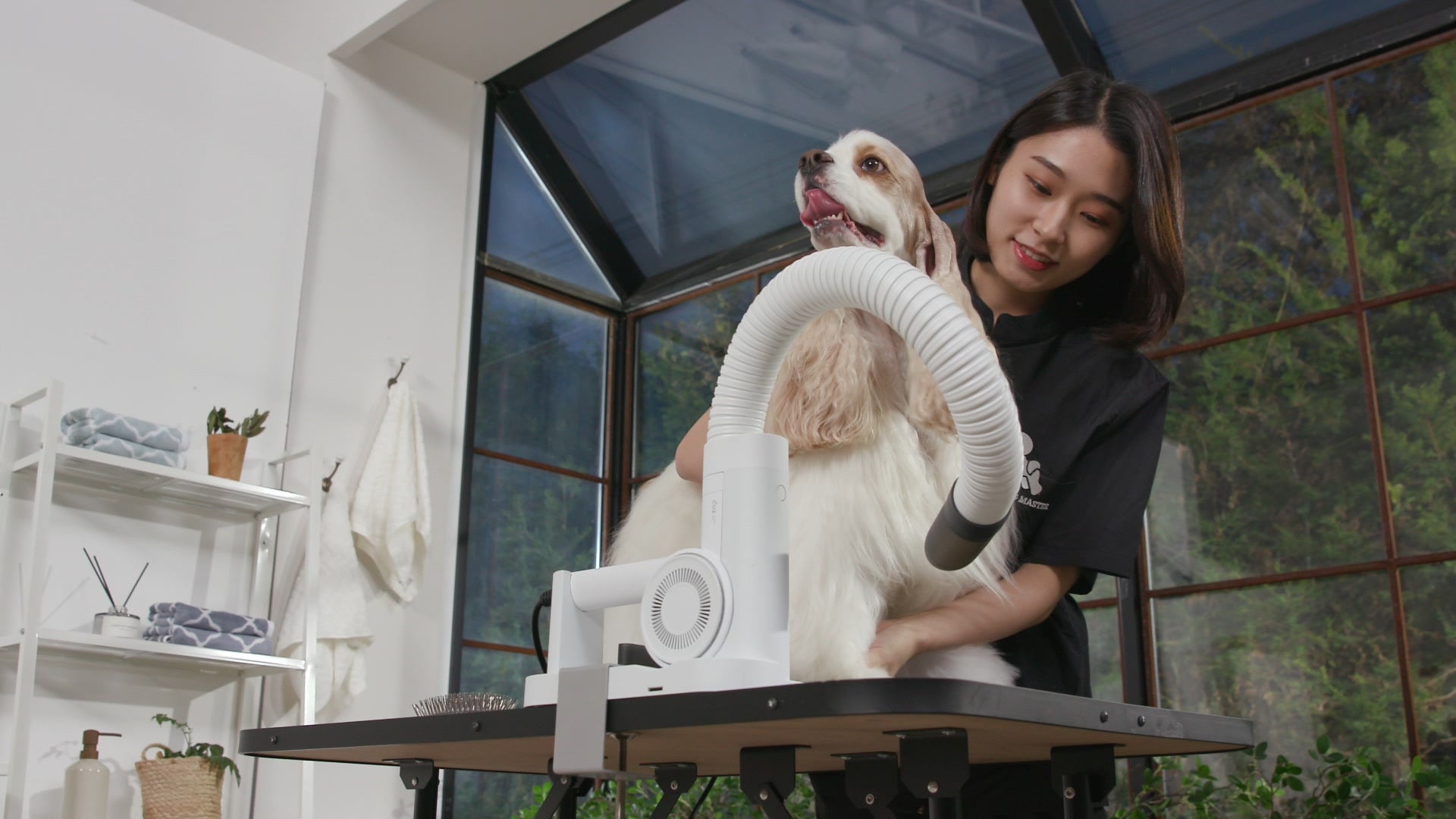 * User-friendly touch buttons provide control over on/off, fan speed (5 settings, 22.2-63.4 CFM), and temperature levels (6 settings, including Cool). The maximum noise level of 69.7dB ensures a calm grooming environment.