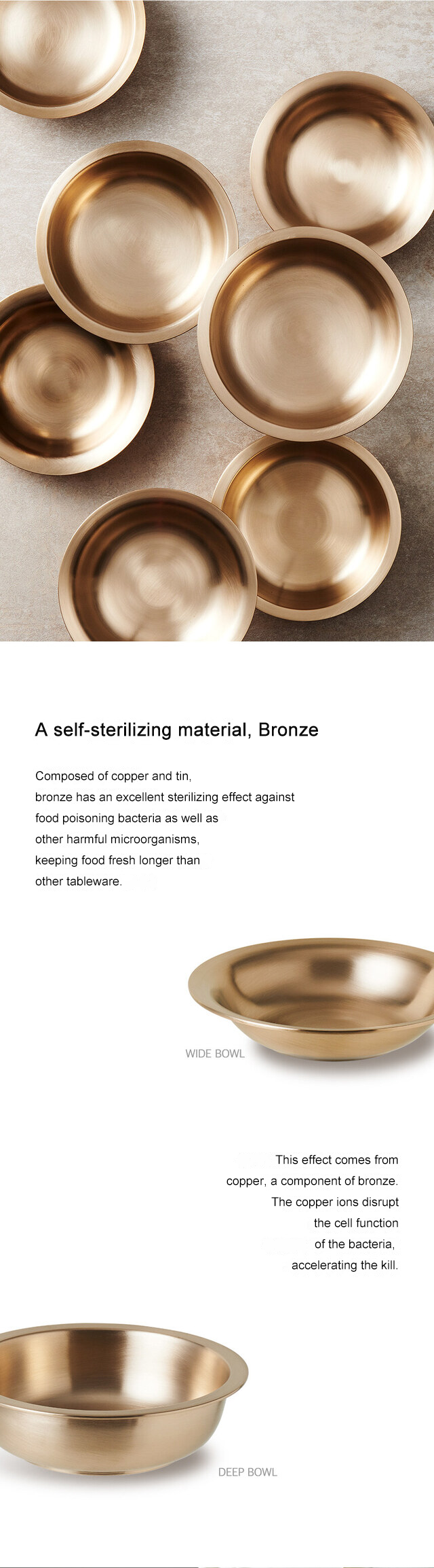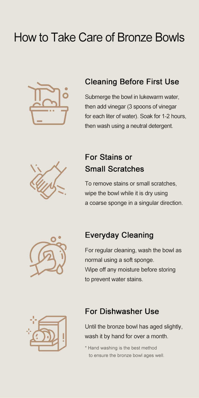 Composed of copper and tin, bronze has an excellent sterilizing effect against food poisoning bacteria as well as other harmful microorganisms, keeping food fresh longer than other tableware.